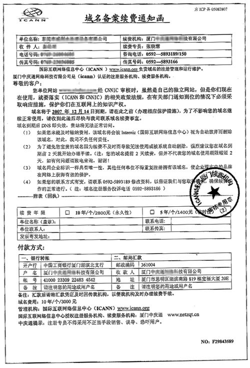 廈門地區(qū)出現(xiàn)的部分不法分子冒充工作人員,以發(fā)傳真或打電話的方式對客戶實(shí)施欺詐,企圖損害客戶的合法權(quán)益。如果通過了解客戶知道了域名為某某公司注冊的,而不是在他們廈門公司注冊的,這些不法分子通常謊稱“某某公司不做了,域名轉(zhuǎn)到他們公司了”或者說“你們這個某某公司是他們的分公司”等,隨后即要求將域名續(xù)費(fèi)款交到其指定賬戶上。在此,信服科技鄭重提醒廣大用戶留意上述行為,避免上當(dāng)受騙。